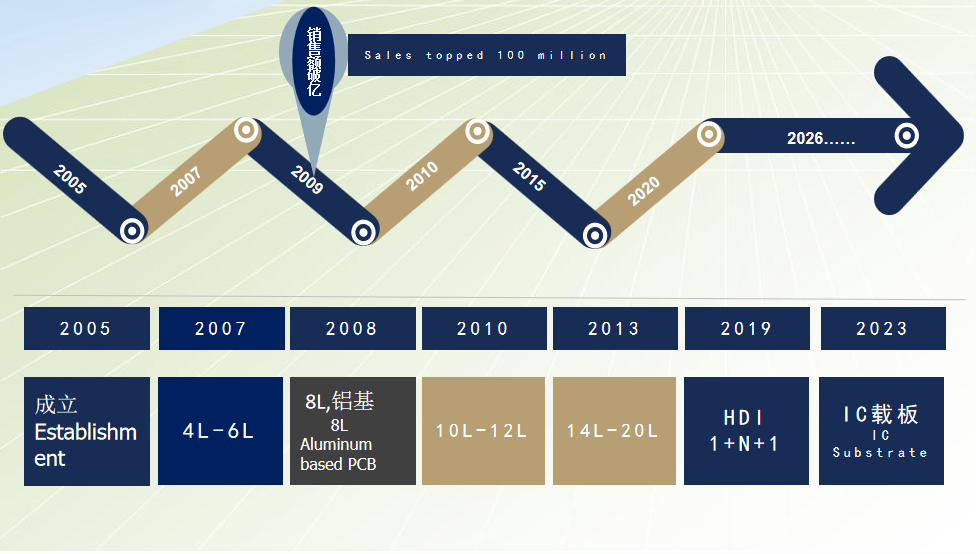 2005年至2006年:主要生产单面和双面印刷电路板。 2007年:开始4-6层PCB生产。 2008年:8层铝基陶瓷PCBs。 2009–2010年:开始生产10层和12层PCB生产。 2011–2014年:开始生产14层和16层印刷电路板。 2015年:HDI印刷电路板原型。